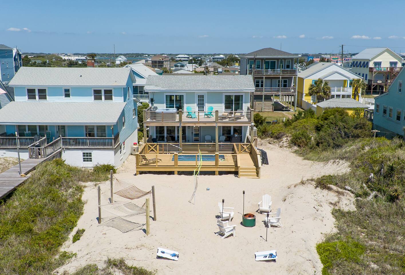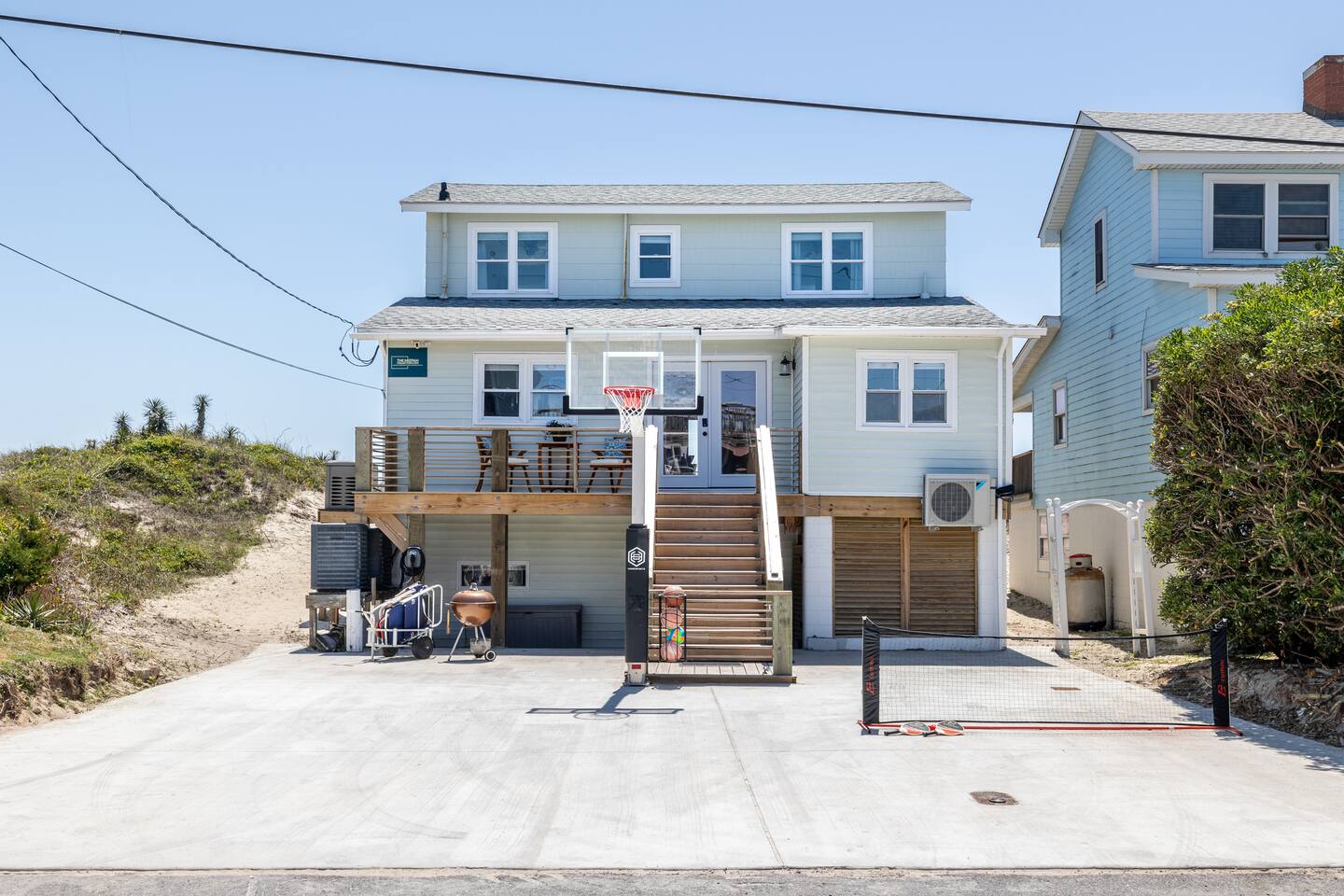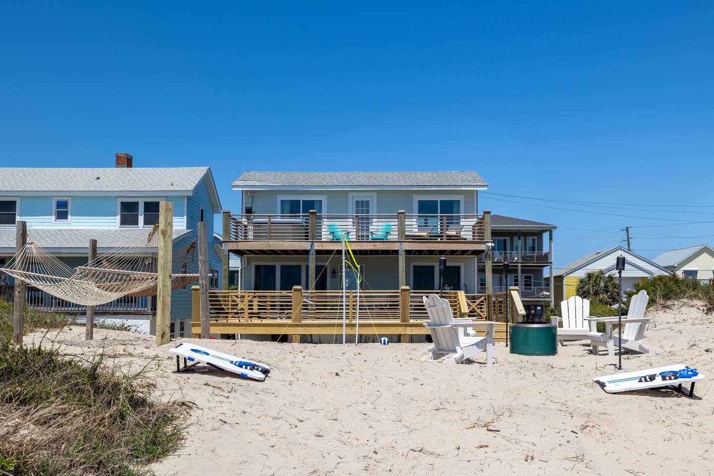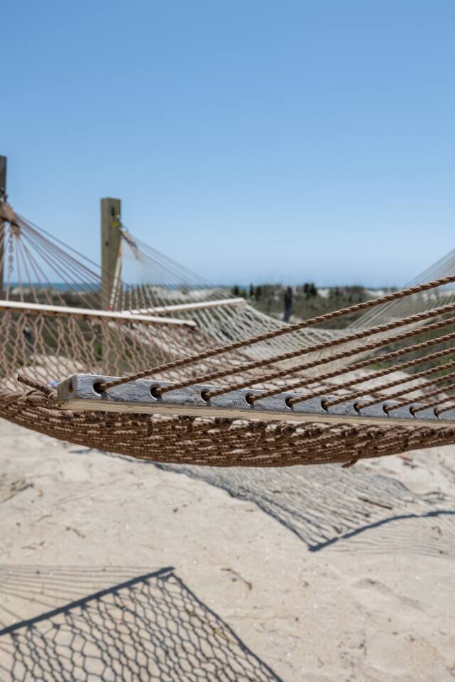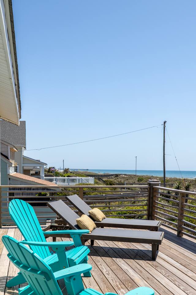 The inside of the house is just as beautiful as the outside, with an open concept main living floor plan, plenty of natural light, and incredible unobstructed Atlantic Ocean views from the two upper levels. We have remodeled (May 20, 2025) the bathrooms on the second (new more functional tub/surround) and third levels(adding bigger shower with expanded bathroom footprint) **Interior Features:** - **Open Concept Living:** Spacious main floor plan with abundant natural light - **Well-Equipped Kitchen:** Stainless steel appliances and ample counter space - **Spacious Bedrooms:** Comfortable rooms with plenty of storage - **Entertainment:** Flat screen Roku smart TVs throughout - **High-Speed Internet:** Fast and reliable Wi-Fi **Outdoor Features:** - **Hammock Garden:** Two luxurious hammocks overlooking the Atlantic Ocean - **Pool & Fire Pit Patio:** New pool, fire pit patio, concrete parking lot, and basketball goal (added in March) - **Hot/Cold Outdoor Showers:** Large 30 sq ft shower at the back and an open shower at the front - **Keyless Entry:** Convenient and secure access **Location:** - **Phenomenal Location:** Quiet street in the heart of Atlantic Beach with direct ocean access - **Proximity to Amenities:** Walking distance to restaurants, shopping, sporting stores, and outdoor activities - **Quiet Environment:** Located on a dead-end road with an empty lot to the east and an older retired couple to the west **Additional Features:** - **Whole Home Generator:** Ensures power continuity during unlikely outages - **Laundry Facilities:** Two washers and dryers on the 1st level - **Third Level Access:** Two sliding glass doors and a regular door to the top deck and hot tub - **First Level:** Includes a game room and two bedrooms and has a separate entrance not connected to the main interior of the top two floors. - **EV Charger:** Recently added in the parking lot for convenient electric vehicle charging Book your stay at this perfect place today and experience the ultimate oceanfront vacation!
