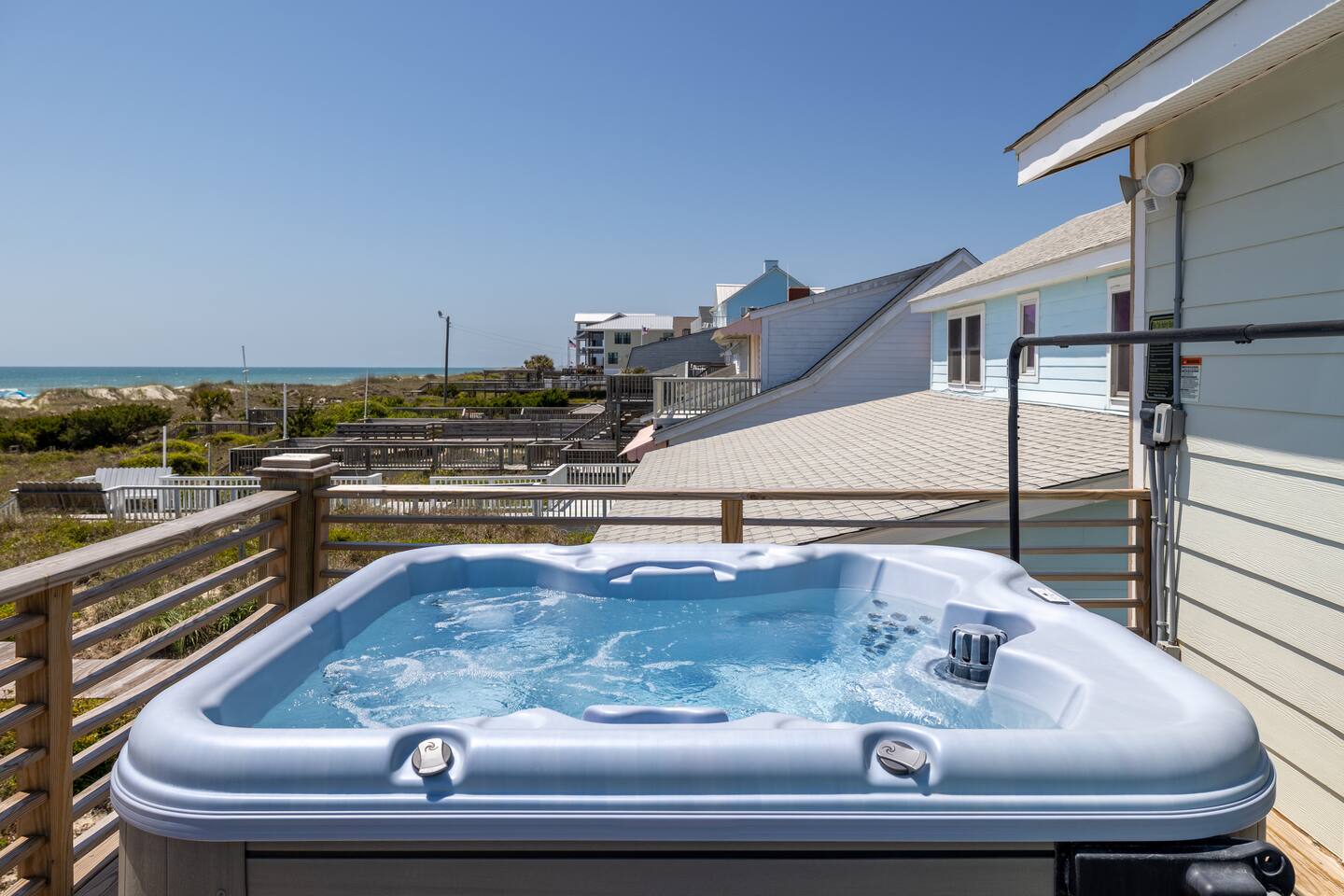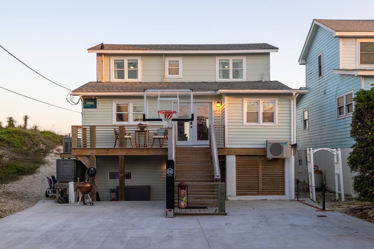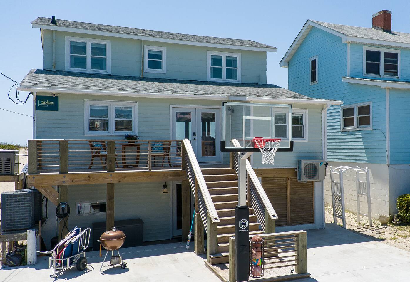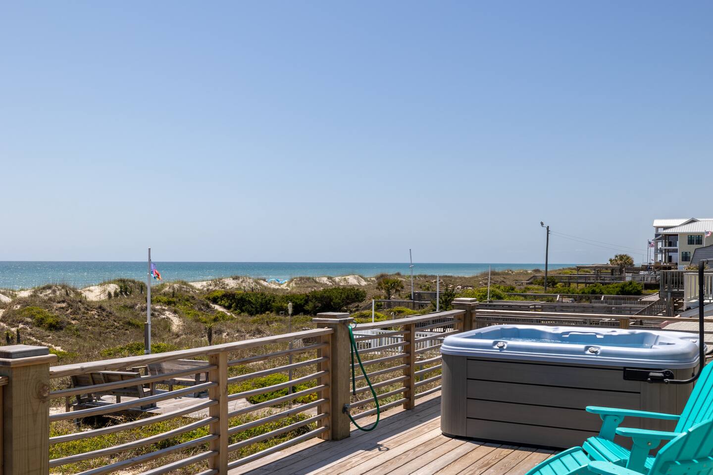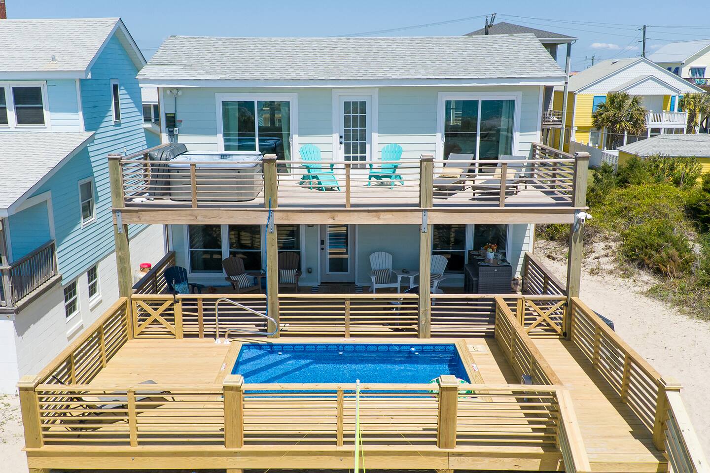 The inside of the house is just as beautiful as the outside, with an open concept main living floor plan, plenty of natural light, and incredible unobstructed Atlantic Ocean views from the two upper levels. We have remodeled (May 20, 2025) the bathrooms on the second (new more functional tub/surround) and third levels(adding bigger shower with expanded bathroom footprint) **Interior Features:** - **Open Concept Living:** Spacious main floor plan with abundant natural light - **Well-Equipped Kitchen:** Stainless steel appliances and ample counter space - **Spacious Bedrooms:** Comfortable rooms with plenty of storage - **Entertainment:** Flat screen Roku smart TVs throughout - **High-Speed Internet:** Fast and reliable Wi-Fi **Outdoor Features:** - **Hammock Garden:** Two luxurious hammocks overlooking the Atlantic Ocean - **Pool & Fire Pit Patio:** New pool, fire pit patio, concrete parking lot, and basketball goal (added in March) - **Hot/Cold Outdoor Showers:** Large 30 sq ft shower at the back and an open shower at the front - **Keyless Entry:** Convenient and secure access **Location:** - **Phenomenal Location:** Quiet street in the heart of Atlantic Beach with direct ocean access - **Proximity to Amenities:** Walking distance to restaurants, shopping, sporting stores, and outdoor activities - **Quiet Environment:** Located on a dead-end road with an empty lot to the east and an older retired couple to the west **Additional Features:** - **Whole Home Generator:** Ensures power continuity during unlikely outages - **Laundry Facilities:** Two washers and dryers on the 1st level - **Third Level Access:** Two sliding glass doors and a regular door to the top deck and hot tub - **First Level:** Includes a game room and two bedrooms and has a separate entrance not connected to the main interior of the top two floors. - **EV Charger:** Recently added in the parking lot for convenient electric vehicle charging Book your stay at this perfect place today and experience the ultimate oceanfront vacation!