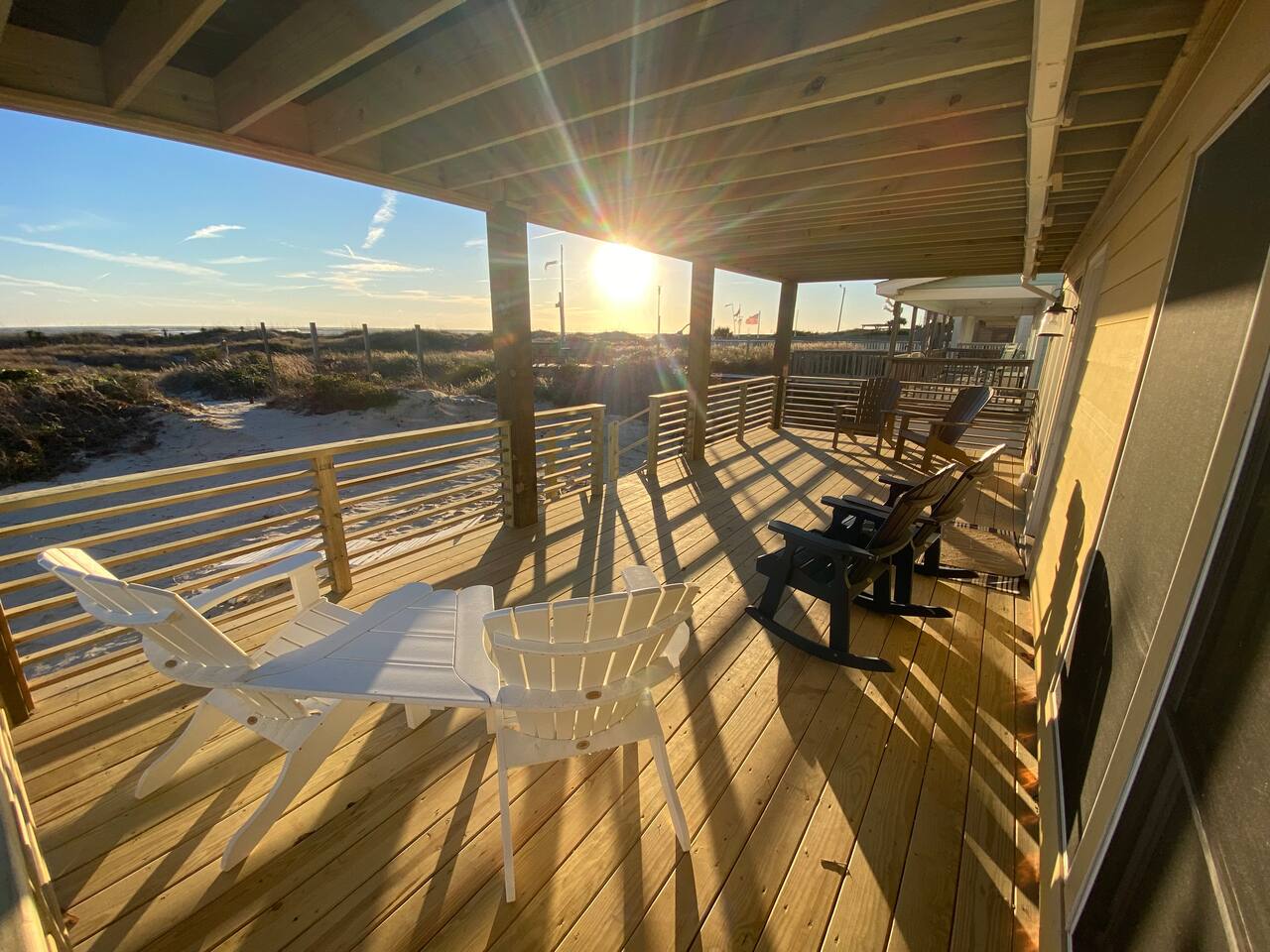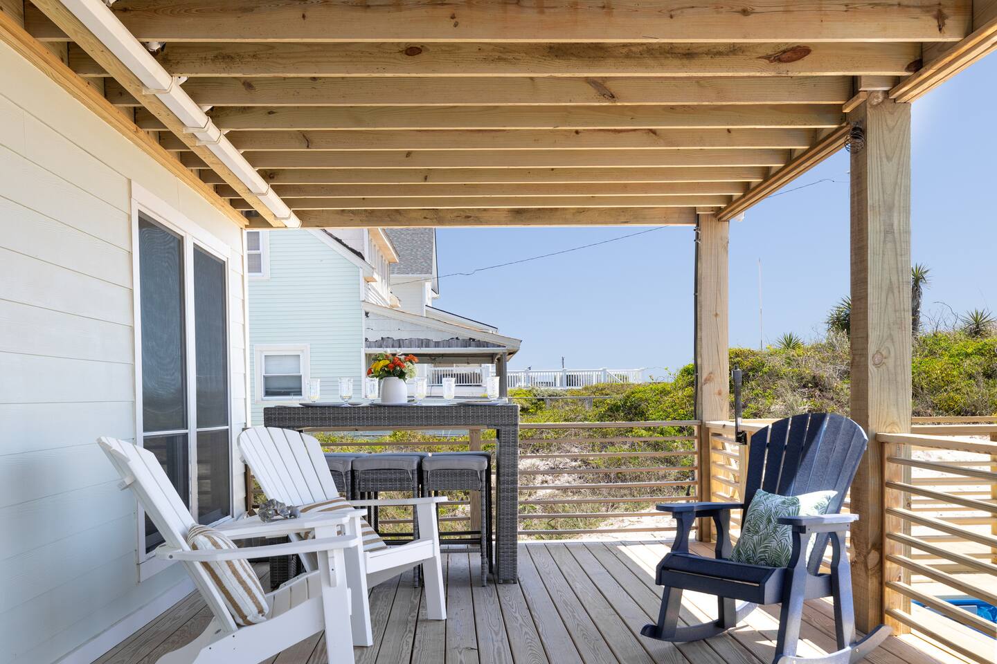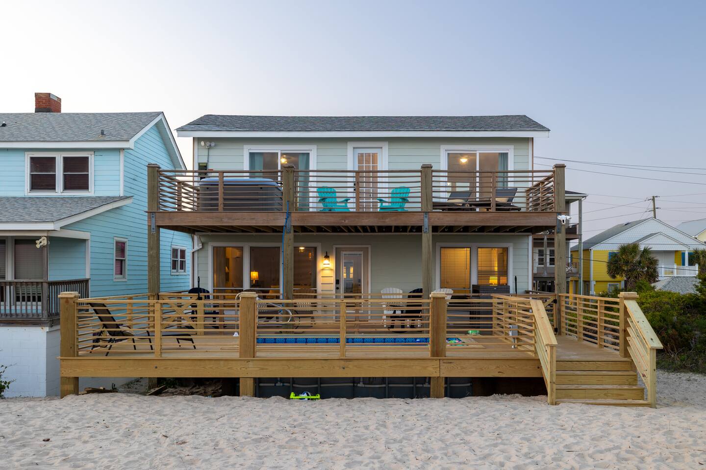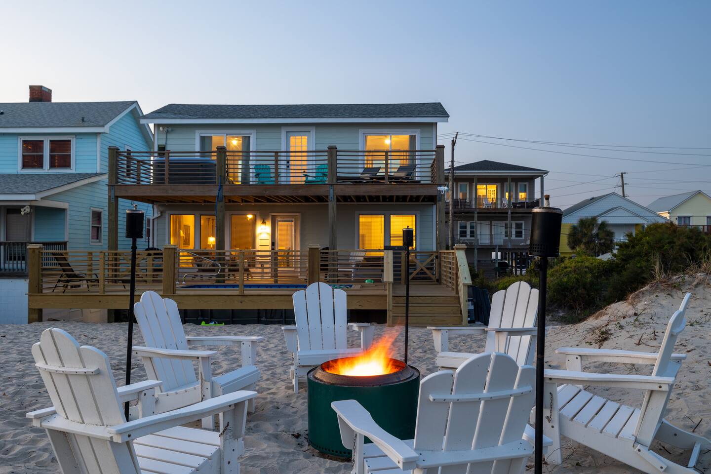 The inside of the house is just as beautiful as the outside, with an open concept main living floor plan, plenty of natural light, and incredible unobstructed Atlantic Ocean views from the two upper levels. We have remodeled (May 20, 2025) the bathrooms on the second (new more functional tub/surround) and third levels(adding bigger shower with expanded bathroom footprint) **Interior Features:** - **Open Concept Living:** Spacious main floor plan with abundant natural light - **Well-Equipped Kitchen:** Stainless steel appliances and ample counter space - **Spacious Bedrooms:** Comfortable rooms with plenty of storage - **Entertainment:** Flat screen Roku smart TVs throughout - **High-Speed Internet:** Fast and reliable Wi-Fi **Outdoor Features:** - **Hammock Garden:** Two luxurious hammocks overlooking the Atlantic Ocean - **Pool & Fire Pit Patio:** New pool, fire pit patio, concrete parking lot, and basketball goal (added in March) - **Hot/Cold Outdoor Showers:** Large 30 sq ft shower at the back and an open shower at the front - **Keyless Entry:** Convenient and secure access **Location:** - **Phenomenal Location:** Quiet street in the heart of Atlantic Beach with direct ocean access - **Proximity to Amenities:** Walking distance to restaurants, shopping, sporting stores, and outdoor activities - **Quiet Environment:** Located on a dead-end road with an empty lot to the east and an older retired couple to the west **Additional Features:** - **Whole Home Generator:** Ensures power continuity during unlikely outages - **Laundry Facilities:** Two washers and dryers on the 1st level - **Third Level Access:** Two sliding glass doors and a regular door to the top deck and hot tub - **First Level:** Includes a game room and two bedrooms and has a separate entrance not connected to the main interior of the top two floors. - **EV Charger:** Recently added in the parking lot for convenient electric vehicle charging Book your stay at this perfect place today and experience the ultimate oceanfront vacation!