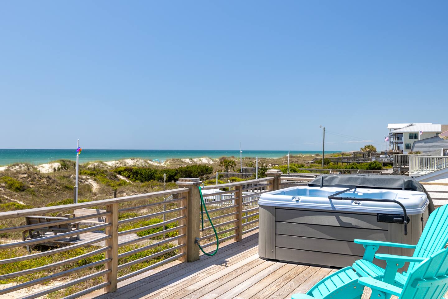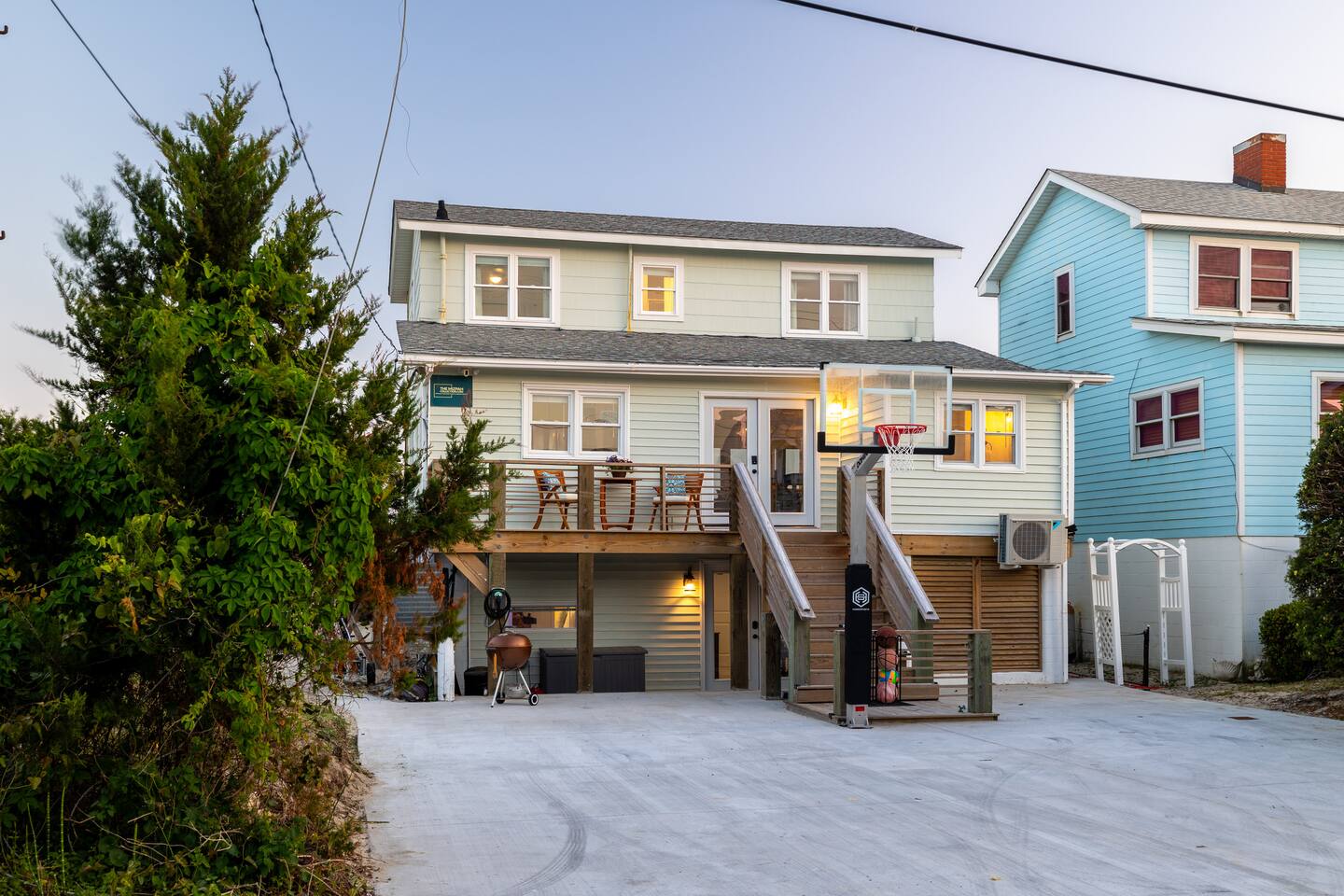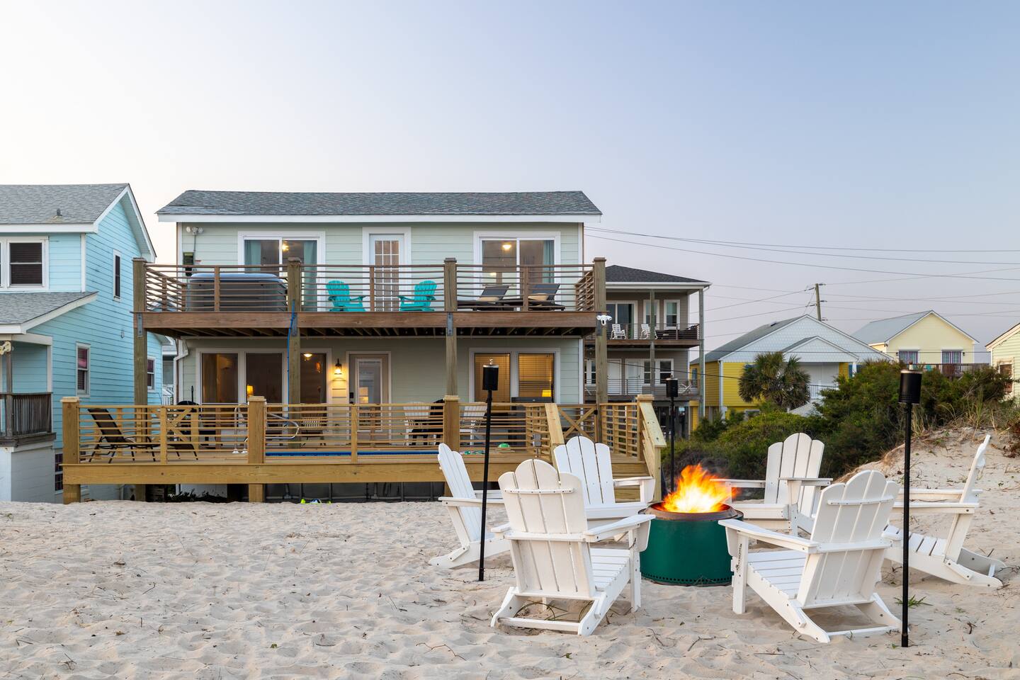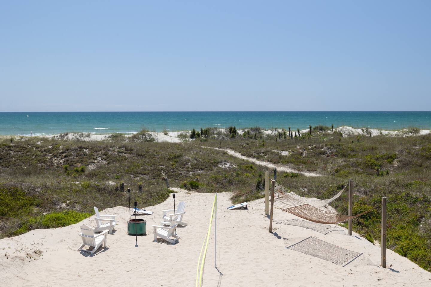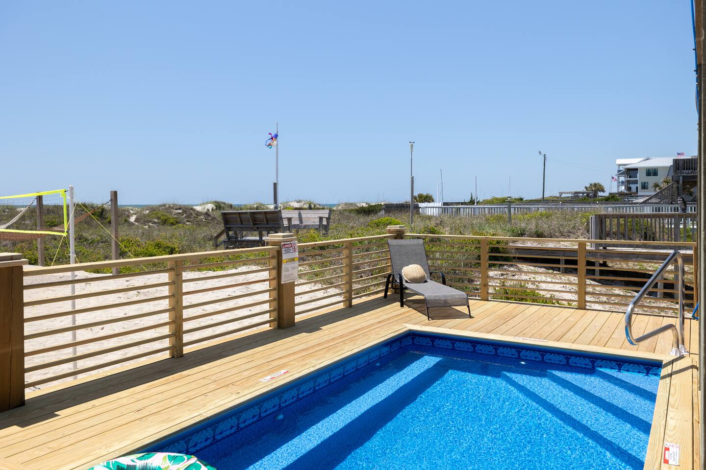 The inside of the house is just as beautiful as the outside, with an open concept main living floor plan, plenty of natural light, and incredible unobstructed Atlantic Ocean views from the two upper levels. We have remodeled (May 20, 2025) the bathrooms on the second (new more functional tub/surround) and third levels(adding bigger shower with expanded bathroom footprint) **Interior Features:** - **Open Concept Living:** Spacious main floor plan with abundant natural light - **Well-Equipped Kitchen:** Stainless steel appliances and ample counter space - **Spacious Bedrooms:** Comfortable rooms with plenty of storage - **Entertainment:** Flat screen Roku smart TVs throughout - **High-Speed Internet:** Fast and reliable Wi-Fi **Outdoor Features:** - **Hammock Garden:** Two luxurious hammocks overlooking the Atlantic Ocean - **Pool & Fire Pit Patio:** New pool, fire pit patio, concrete parking lot, and basketball goal (added in March) - **Hot/Cold Outdoor Showers:** Large 30 sq ft shower at the back and an open shower at the front - **Keyless Entry:** Convenient and secure access **Location:** - **Phenomenal Location:** Quiet street in the heart of Atlantic Beach with direct ocean access - **Proximity to Amenities:** Walking distance to restaurants, shopping, sporting stores, and outdoor activities - **Quiet Environment:** Located on a dead-end road with an empty lot to the east and an older retired couple to the west **Additional Features:** - **Whole Home Generator:** Ensures power continuity during unlikely outages - **Laundry Facilities:** Two washers and dryers on the 1st level - **Third Level Access:** Two sliding glass doors and a regular door to the top deck and hot tub - **First Level:** Includes a game room and two bedrooms and has a separate entrance not connected to the main interior of the top two floors. - **EV Charger:** Recently added in the parking lot for convenient electric vehicle charging Book your stay at this perfect place today and experience the ultimate oceanfront vacation!